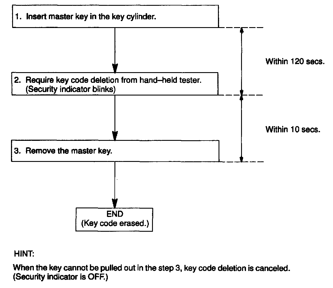 - When replacing "Ignition Cylinder Key Set" or "Lock Cylinder Set" register according to the following procedure using the original master key. However, after the registration of the additional master key, as the original master key and the original sub-key are not necessary any more, erase registered of those key codes.