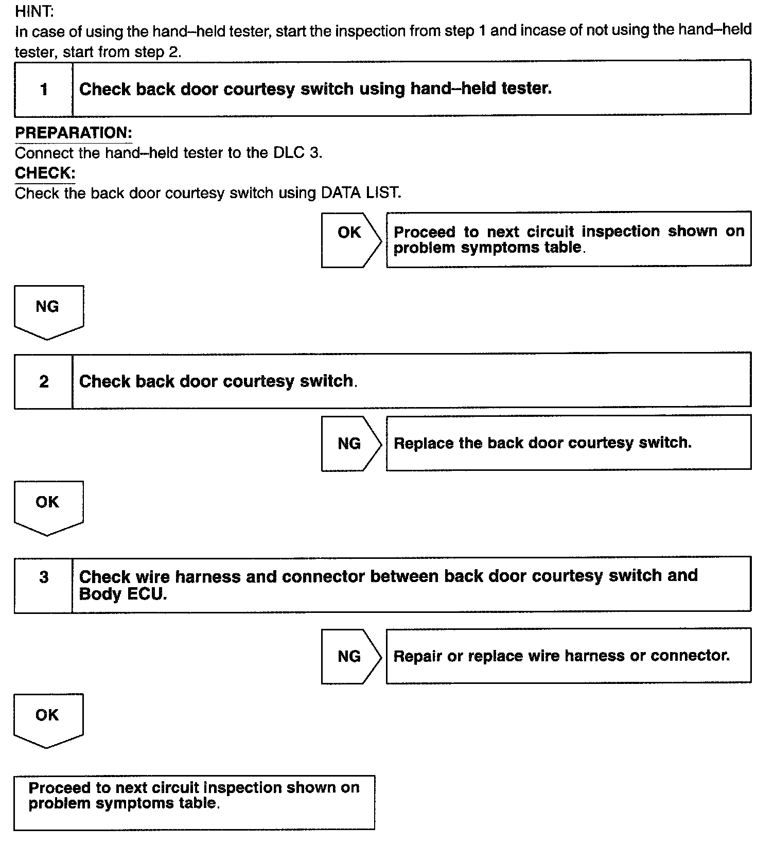 The back door courtesy switch goes on when back door is opened and goes off when back door is closed.