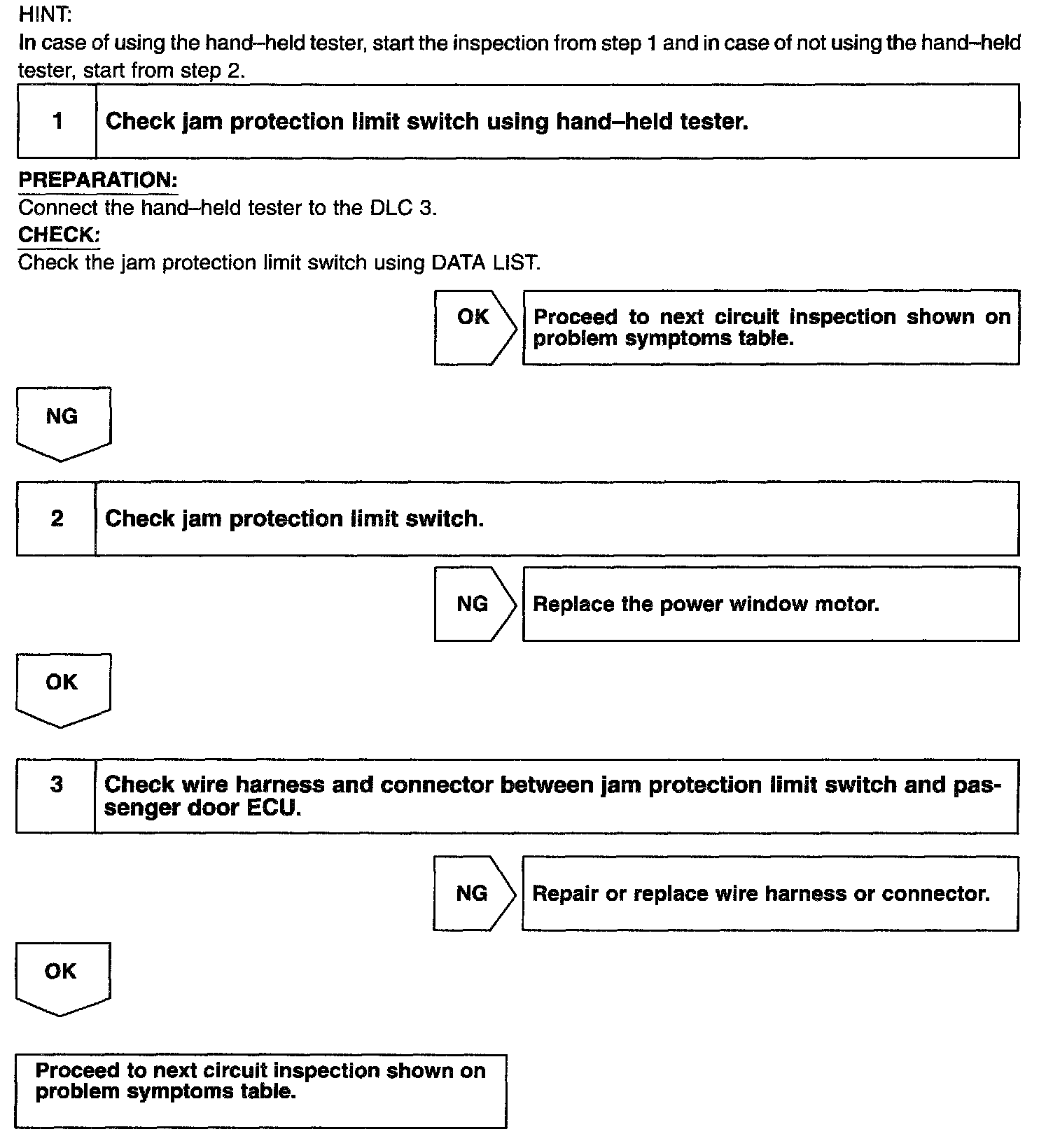 CIRCUIT DESCRIPTIONJam protection limit switch is built-in the power window motor This switch functions to turn "OFF" before the top dead center, and ECU reads this "OFF" signal resulting in closing the window fully.