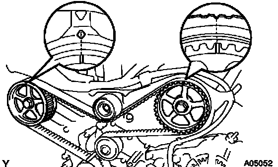 d. Align the installation marks on the timing belt with the timing marks of the camshaft timing pulleys.