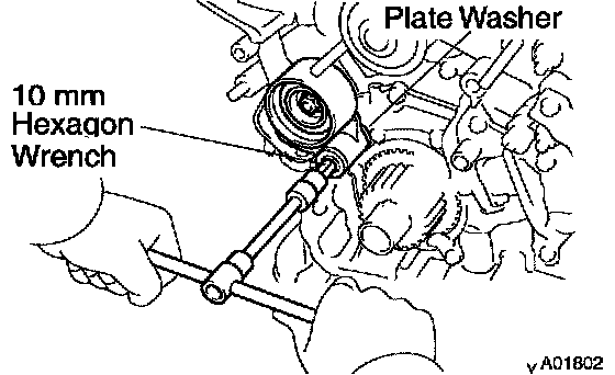 Using a 10 mm hexagon wrench, remove the bolt, idler pulley and plate washer.