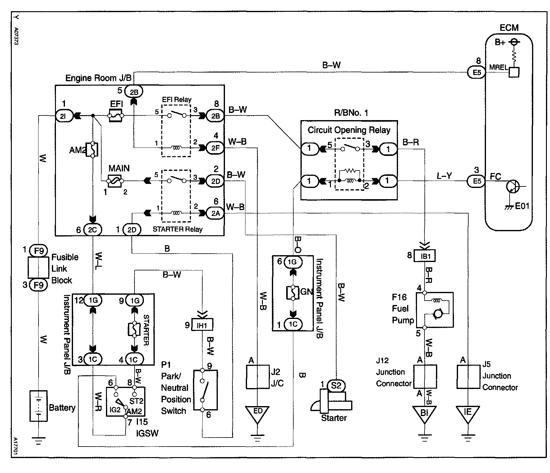 CIRCUIT DESCRIPTIONIn the diagram, when the engine is cranked, current flows from terminal ST of the ignition switch to the starter relay coil and also current flows to terminal STA of ECM (STA signal).