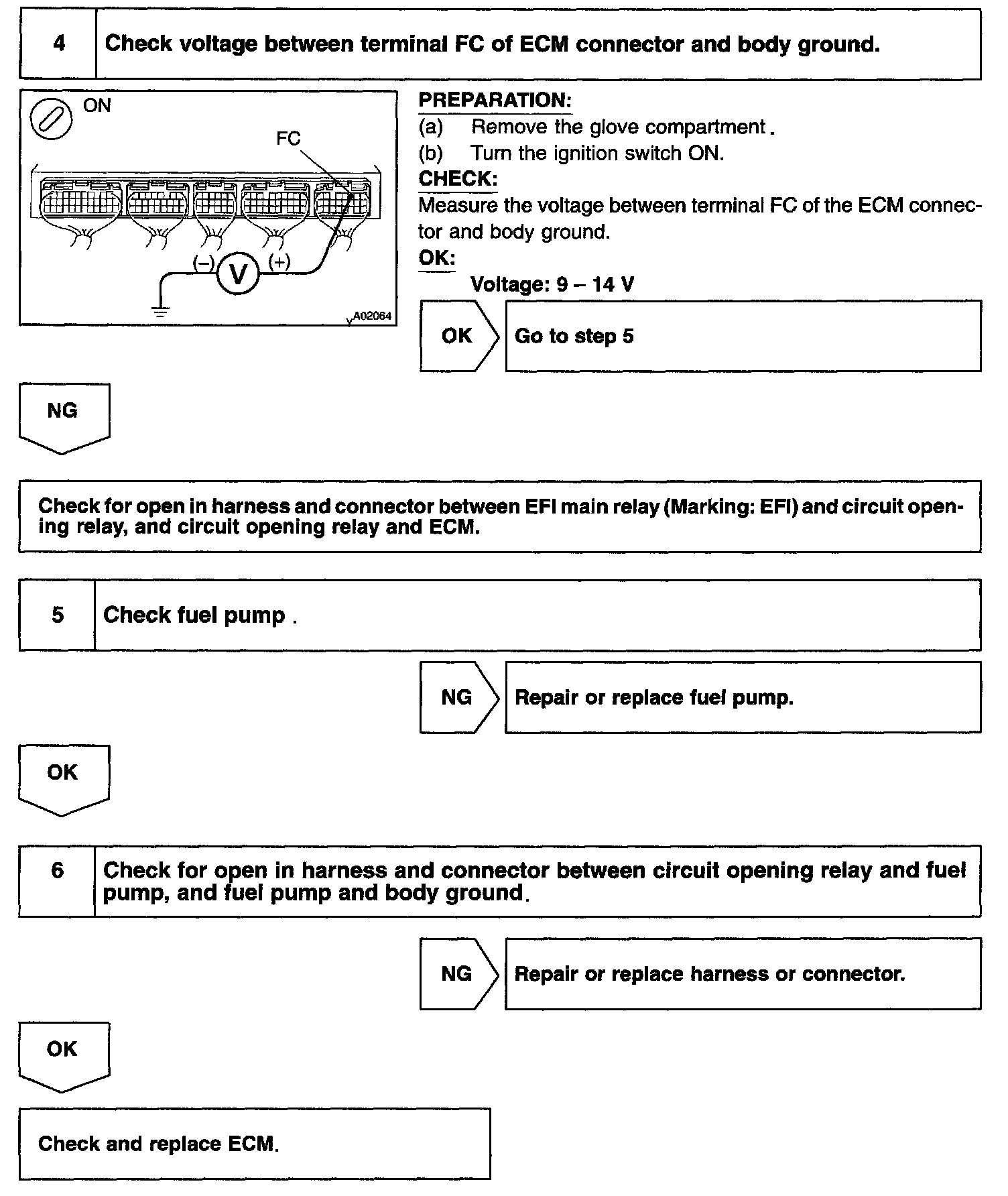 When the STA signal and NE signal are input to the ECM, Tr is turned ON, current flows to coil of the circuit opening relay, the relay switches on, power is supplied to the fuel pump and the fuel pump operates. While the NE signal is generated (engine running), the ECM keeps Tr ON (circuit opening relay ON) and the fuel pump also keeps operating.