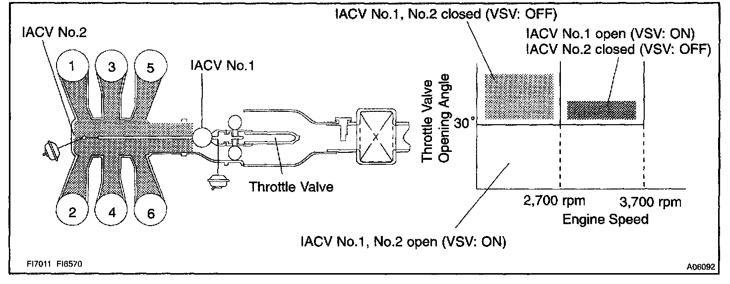 When the engine speed is 2,700 rpm or less, or 3,700 rpm or less and the throttle valve opening angle is 30 ° or more, the ECM turns the two VSV ON or OFF and operate the IACV.