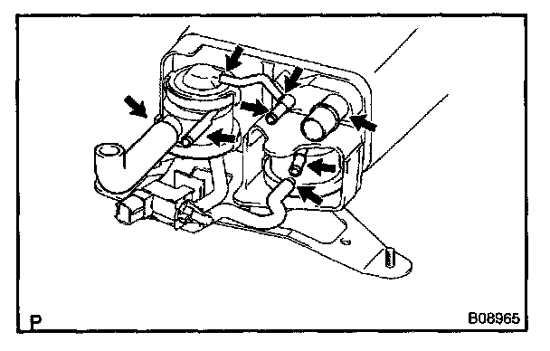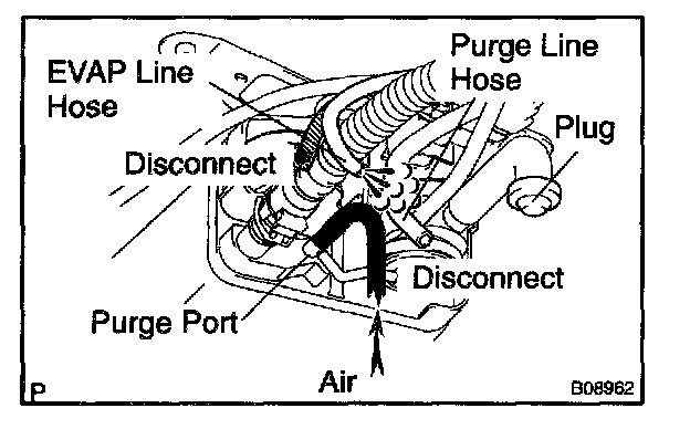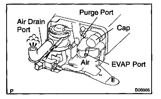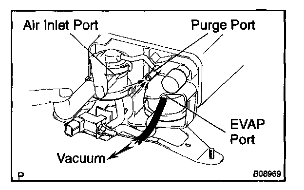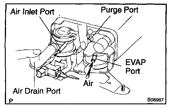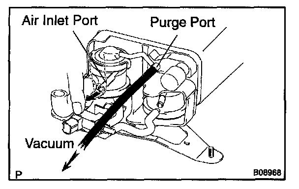 5. While holding the air inlet port closed, apply vacuum (3.43 kPa, 25.7 mmHg, 1.01 in.Hg) to the EVAP port and check that air flows into the purge port.