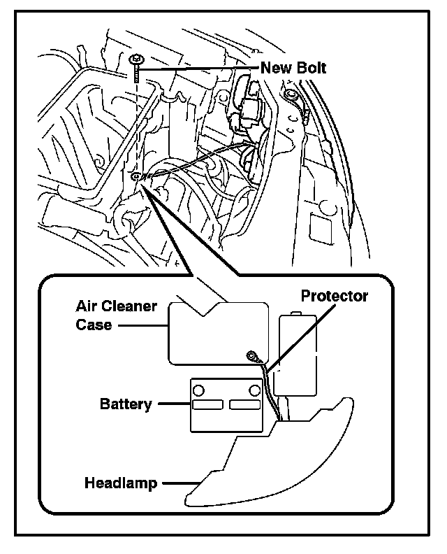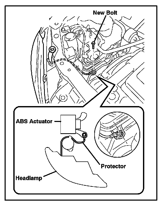 B. Position the headlamp protector as shown in the illustration and secure it to the ABS actuator bracket with a NEW bolt (P/N: 90119--08A61).