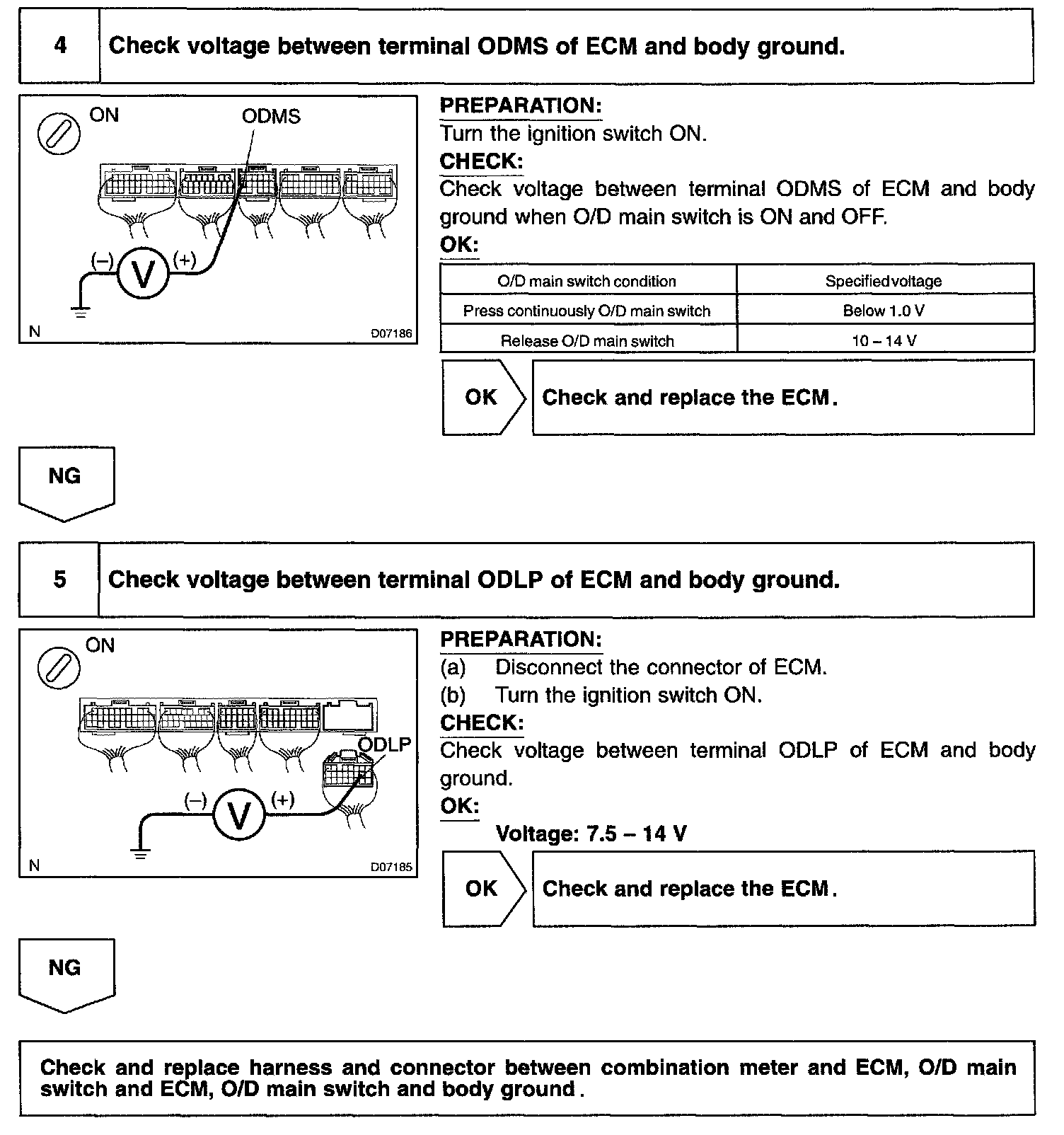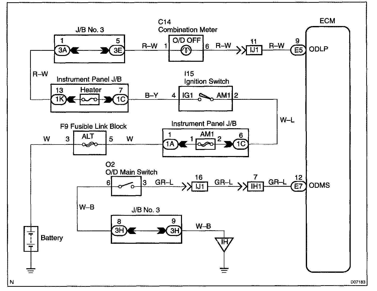 CIRCUIT DESCRIPTIONThe O/D main switch is a momentary type switch. When pressing the O/D main switch, the O/D OFF indicator light lights up and ECM prohibits shifting to O/D, and when pressing it again, the O/D OFF indicator light goes off and ECM allows shifting to O/D. Turning the IG switch OFF will reset the O/D OFF indicator light.