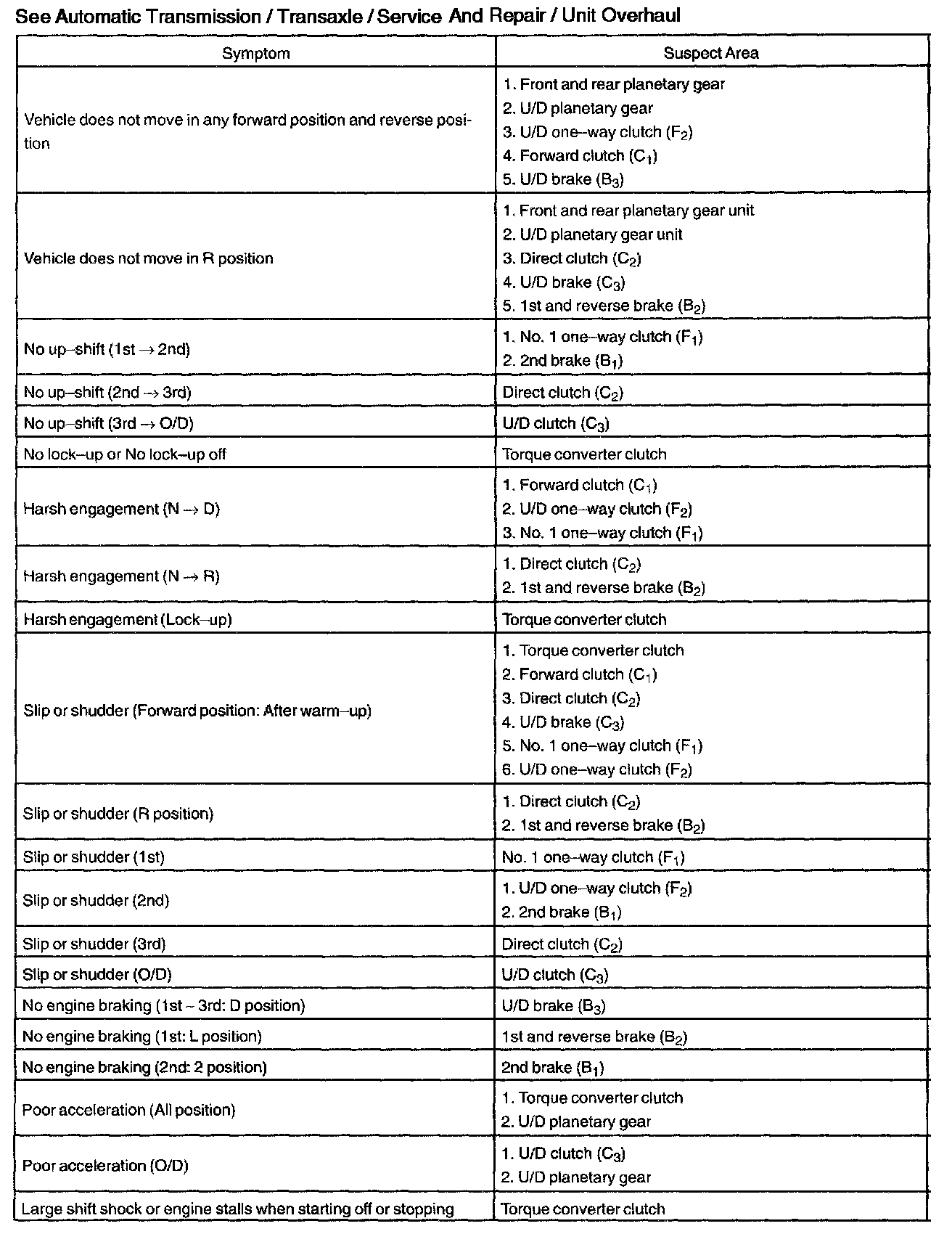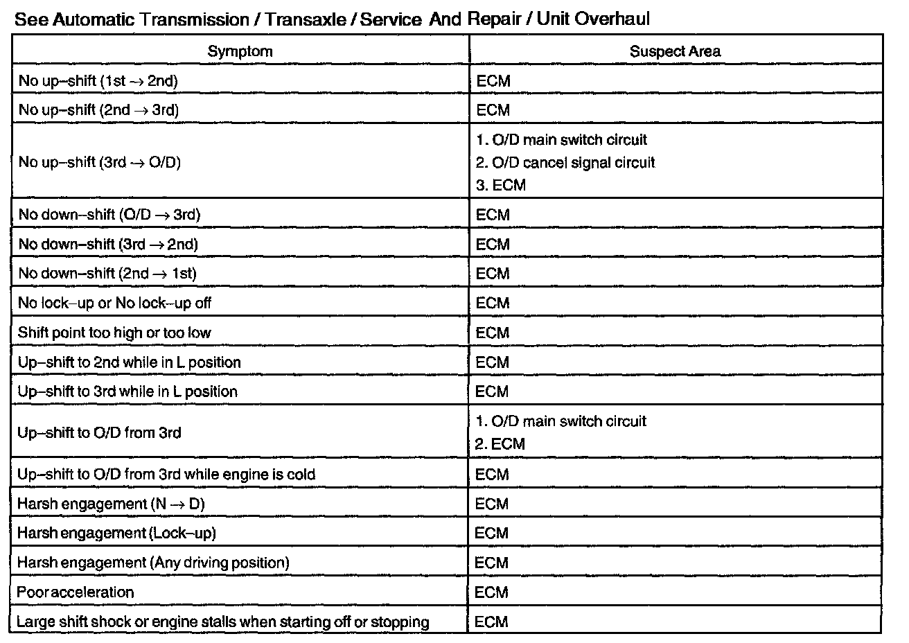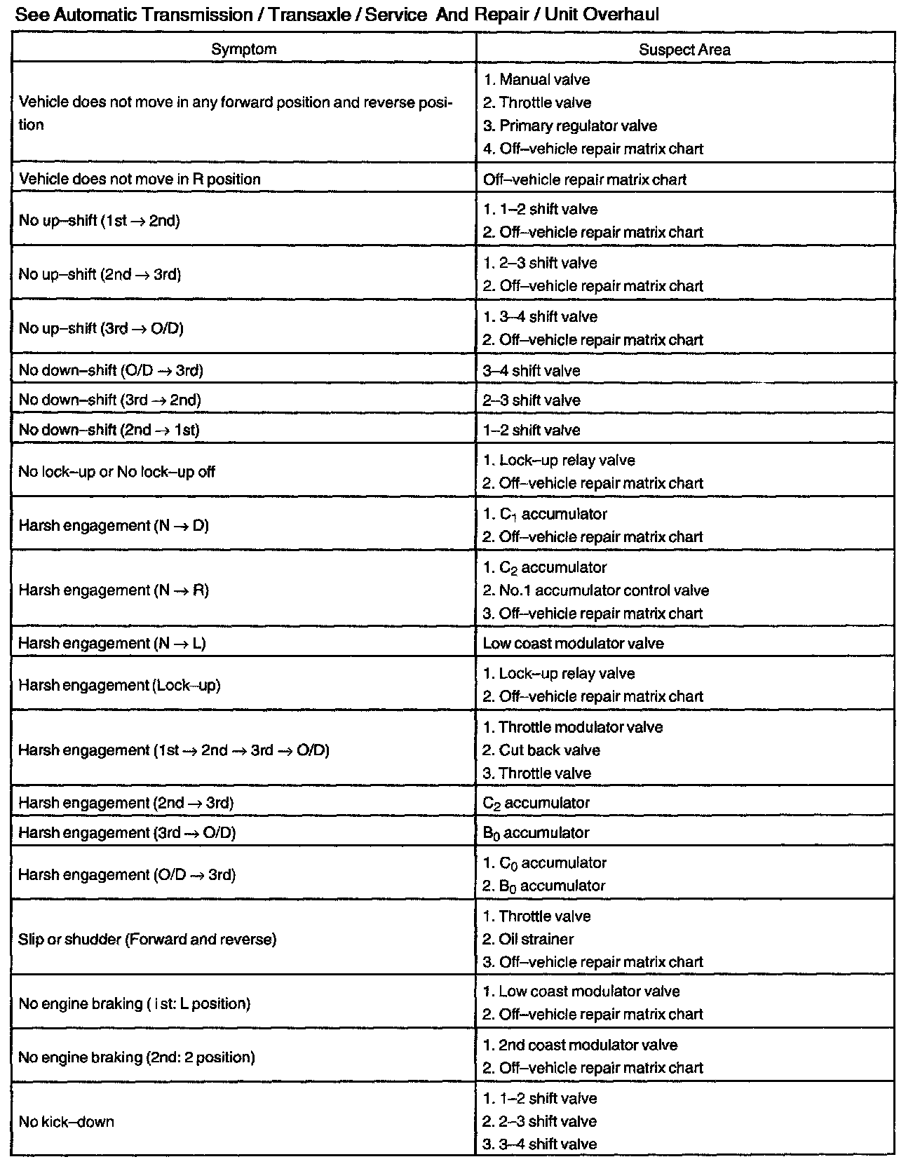 PROBLEM SYMPTOMS TABLEIf a normal code is displayed during the diagnostic trouble code check but the trouble still occurs, check the circuits for each symptom in the order given in the charts and proceed to the troubleshooting.