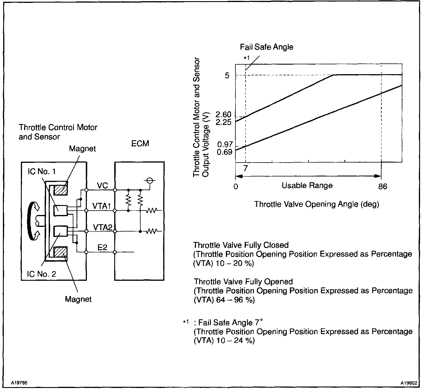The throttle control motor and sensor is mounted on the throttle body to detect the opening angle of the throttle valve. Since this sensor is electronically controlled with hall elements, accurate control and reliability can be obtained. It has 2 sensors to detect the throttle opening angle and a malfunction of the throttle control motor and sensor. The voltage applied to the terminals VTA1 and VTA2 of the ECM changes between 0 V and 5 V in proportion to the opening angle of the throttle valve. The VTA1 is a signal to indicate the actual throttle valve opening angle which is used for the engine control, and the VTA2 is a signal to indicate the information about the opening angle which is used for detecting a malfunction.