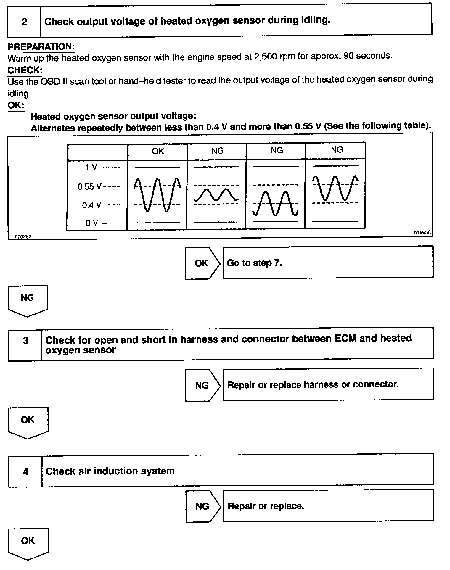 When the air-fuel ratio becomes LEAN, the oxygen concentration in the exhaust increases and the heated oxygen sensor informs the ECM of the LEAN condition (small electromotive force: <0.45 V).