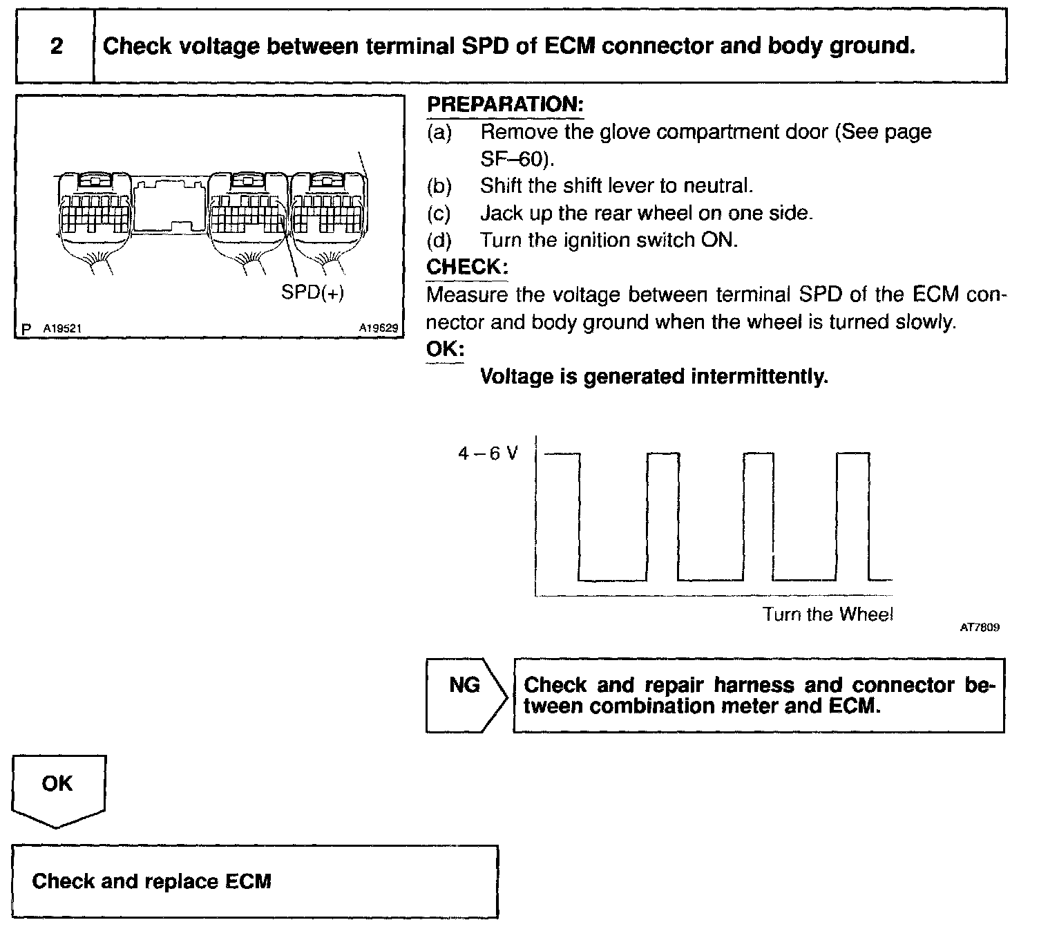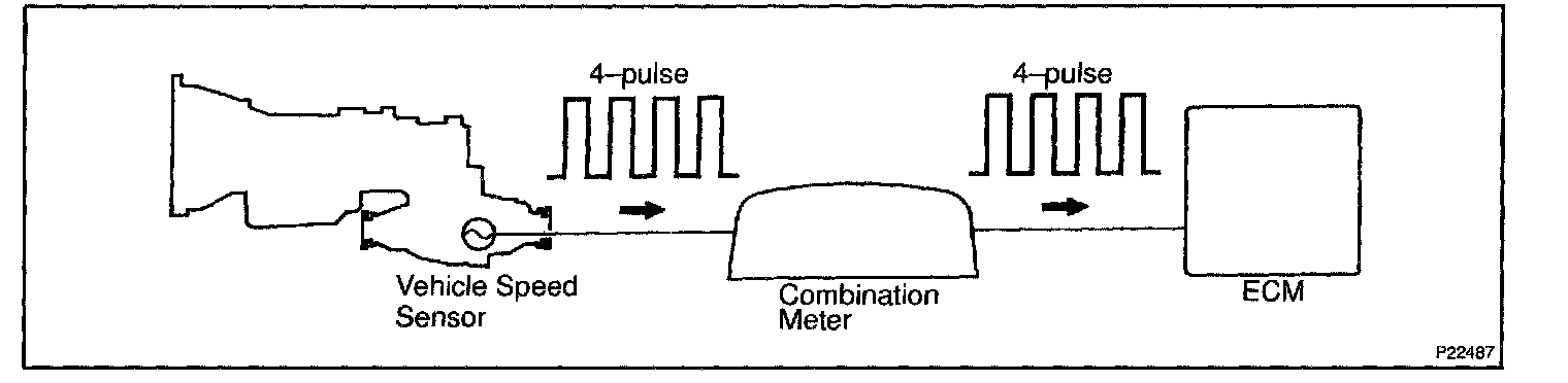 The No.1 vehicle speed sensor outputs a 4-pulse signal for every revolution of the rotor shaft, which is rotated by the transmission output shaft via the driven gear. After this signal is converted into a more precise rectangular waveform by the waveform shaping circuit inside the combination meter, it is then transmitted to the ECM. The ECM determines the vehicle speed based on the frequency of these pulse signals.