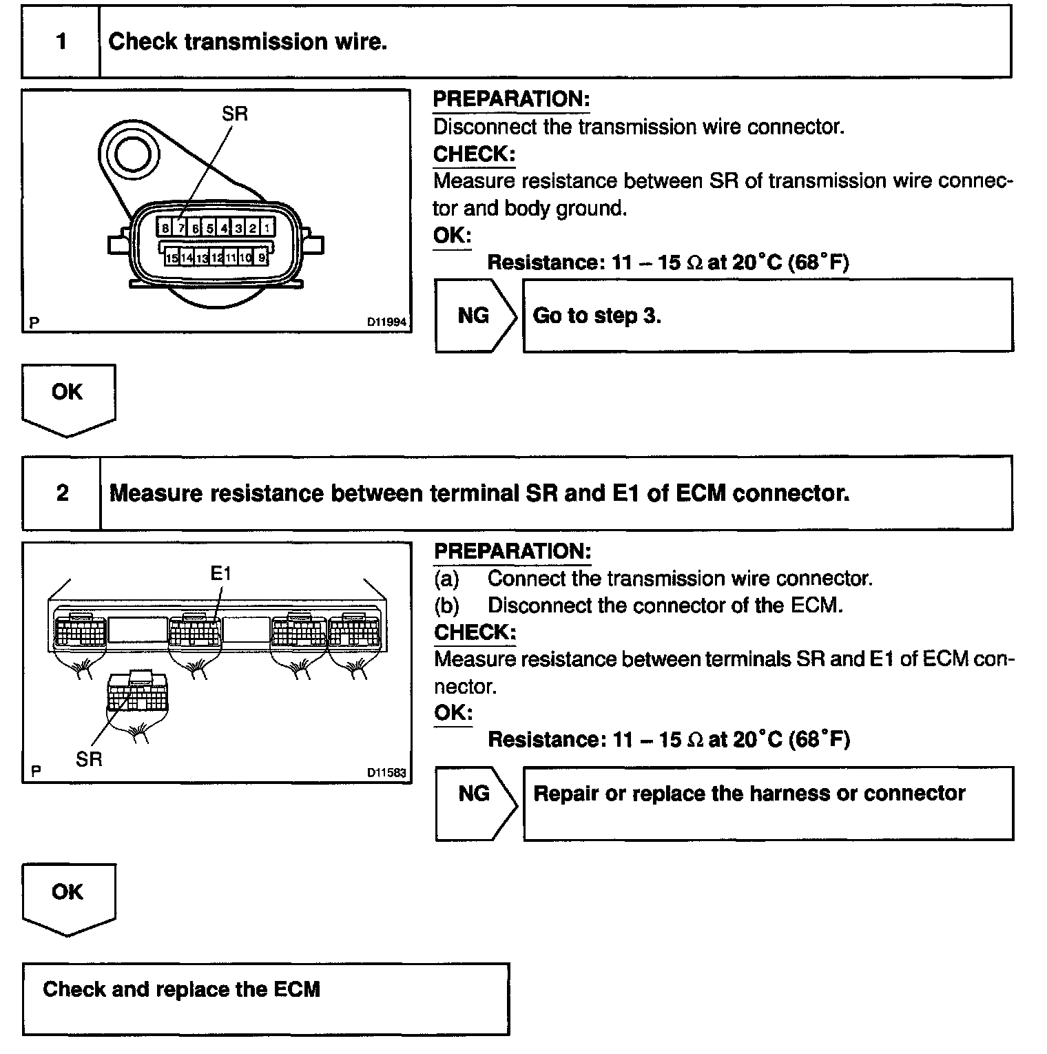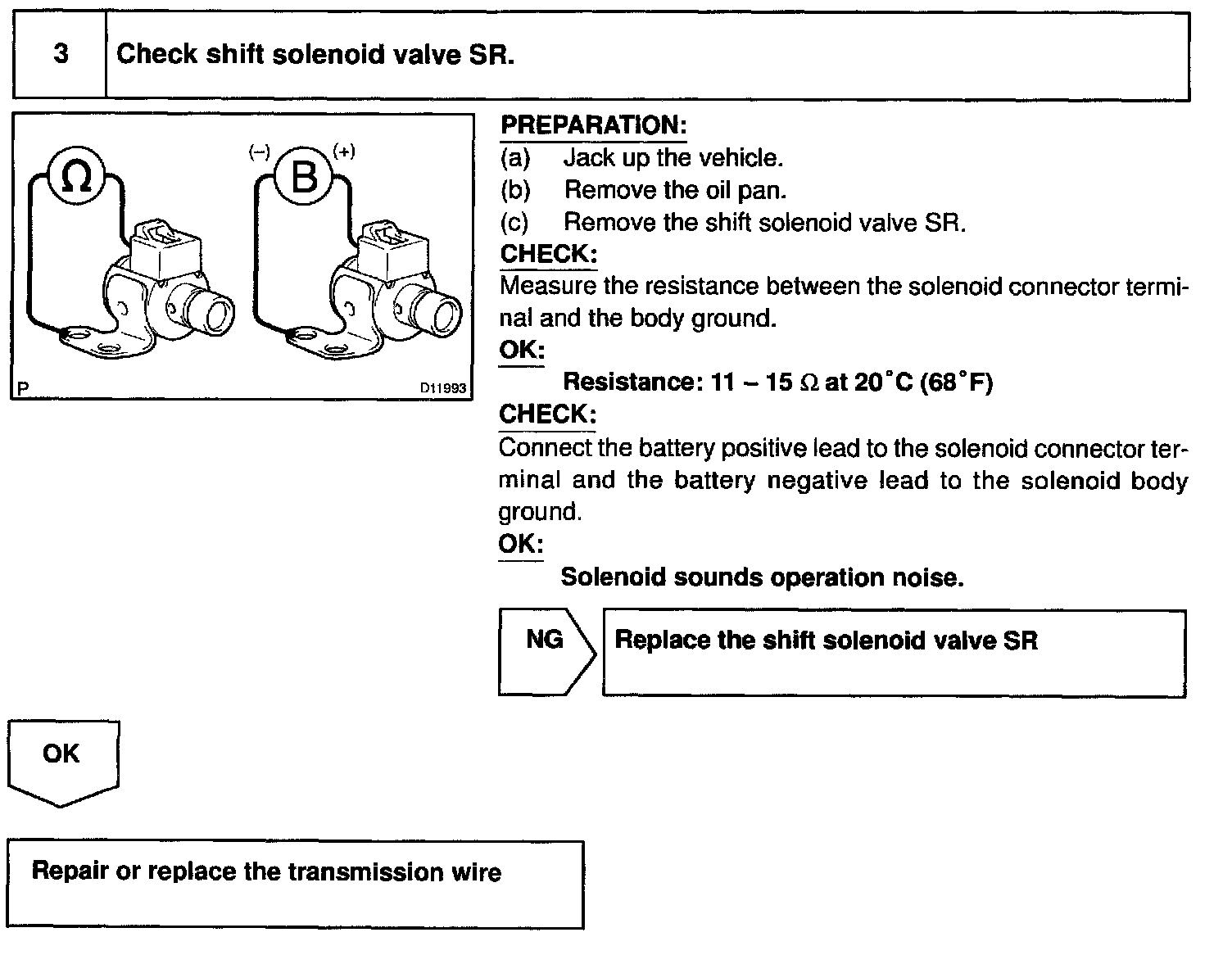 If either of the shift solenoid valve circuits develops an open or short, the ECM turns the other shift solenoid ON and OFF to shift to the gear positions shown in the table.