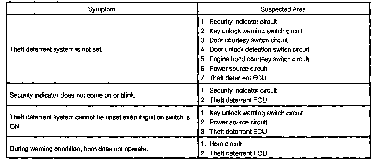 HINT: Troubleshooting of the theft deterrent system is based on the premise that the door lock control system is operating normally. Accordingly, before troubleshooting the theft deterrent system, first make certain that the door lock control system is operating normally.