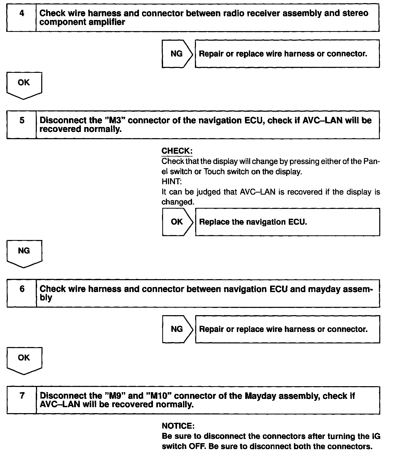 When +B short and GND short occur in this AVC-LAN navigation system will not function normally as the communication is discontinued.