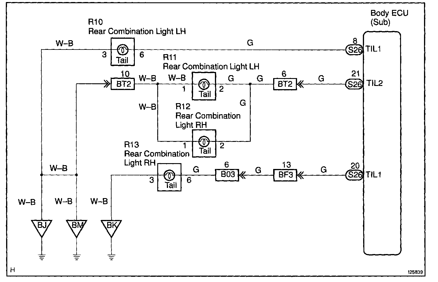 - A signal passed through "TIL1" terminal turns on the taillight on the right/left side on the body side.