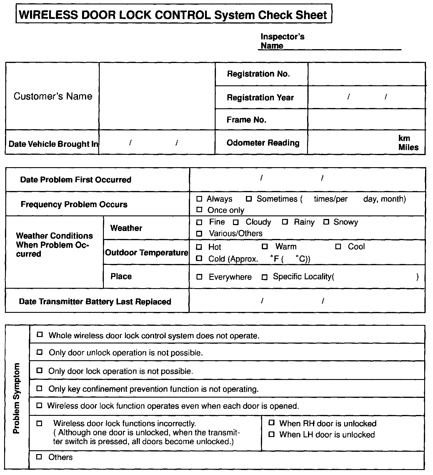 Wireless Door Lock Control System Check Sheet: