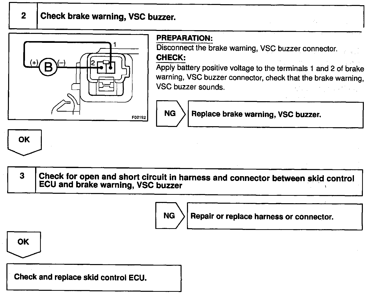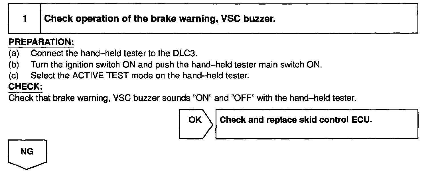 CIRCUIT DESCRIPTIONThe brake warning, VSC buzzer sounds while the accumulator pressure is abnormally low or an abnormality casing low fluid pressure occurs VSC is activated.