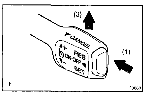 4. Momentarily pull up the control switch upward to the +/RES and then immediately release it. Check that the vehicle speed increases by about 1.5 km/h (Tap-up function).