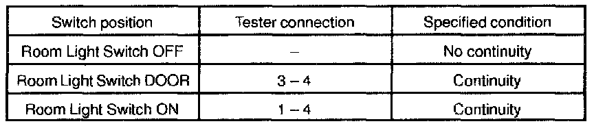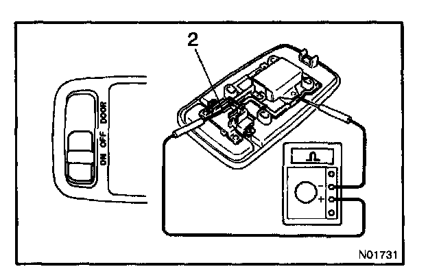 c. Turn the room light switch DOOR, check that continuity exists between terminal 1 and 2.