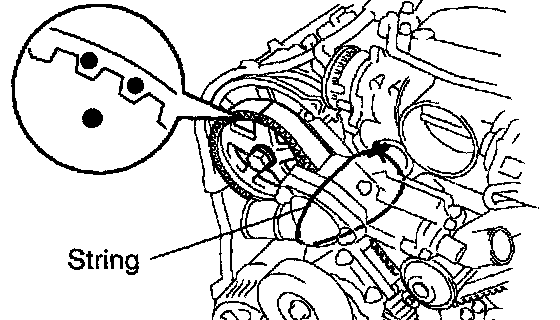 ^ When replacing timing belt tensioner only: To avoid meshing of the timing pulley and the timing belt, secure one of them with string, and then place matchmarks on the timing belt and the RH camshaft timing pulley.