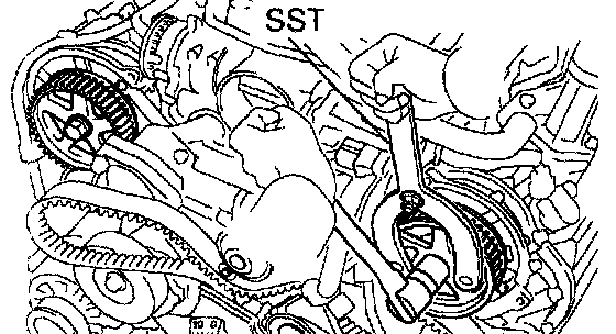 a. Using SST, loosen the tension spring between the LH and RH camshaft timing pulleys by slightly turning the LH camshaft timing pulley clockwise.