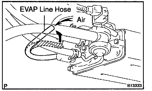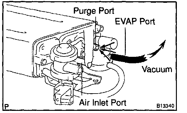4. While holding the air inlet port closed, apply vacuum (3.43 kPa, 25.7 mmHg, 1.01 in Hg) to the EVAP port and check that air flows into the purge port.