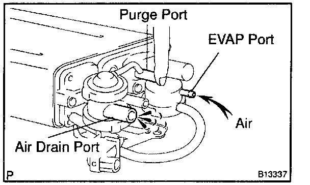 1. While holding the purge port closed, blow air (1.76 kPa, 18 gf/sq.cm, 0.26 psi) into the EVAP port and check that air flows from the air drain port.