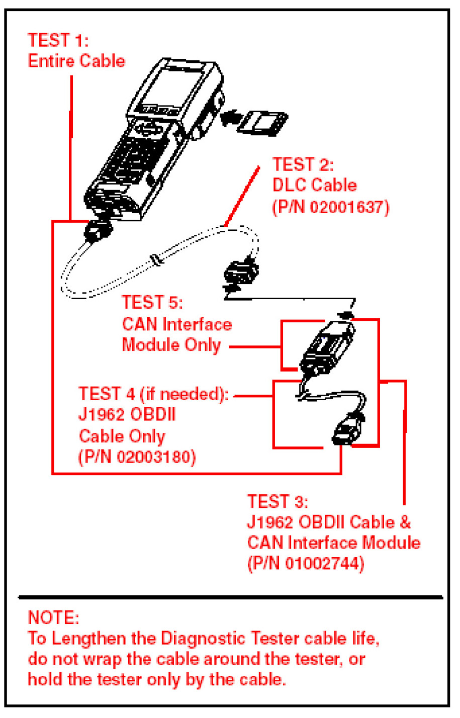 The Diagnostic Tester may operate properly in other modes such as OBD, OBDII, or CARB, with a damaged cable.
