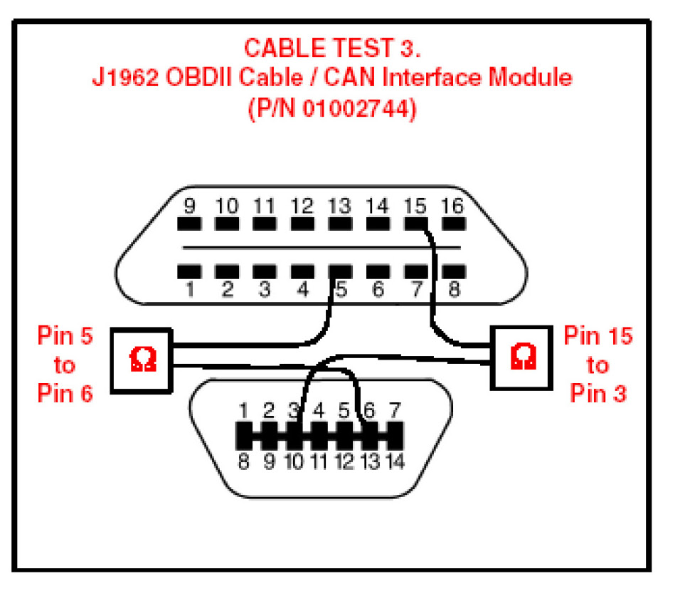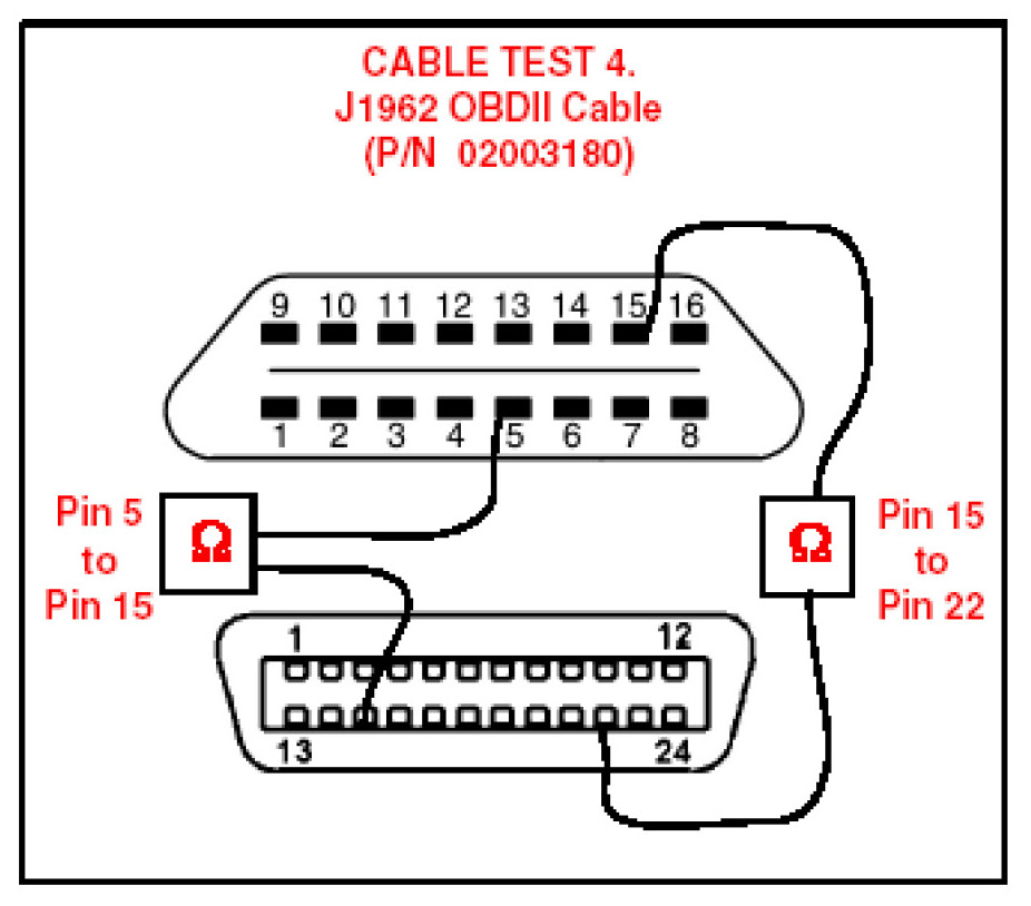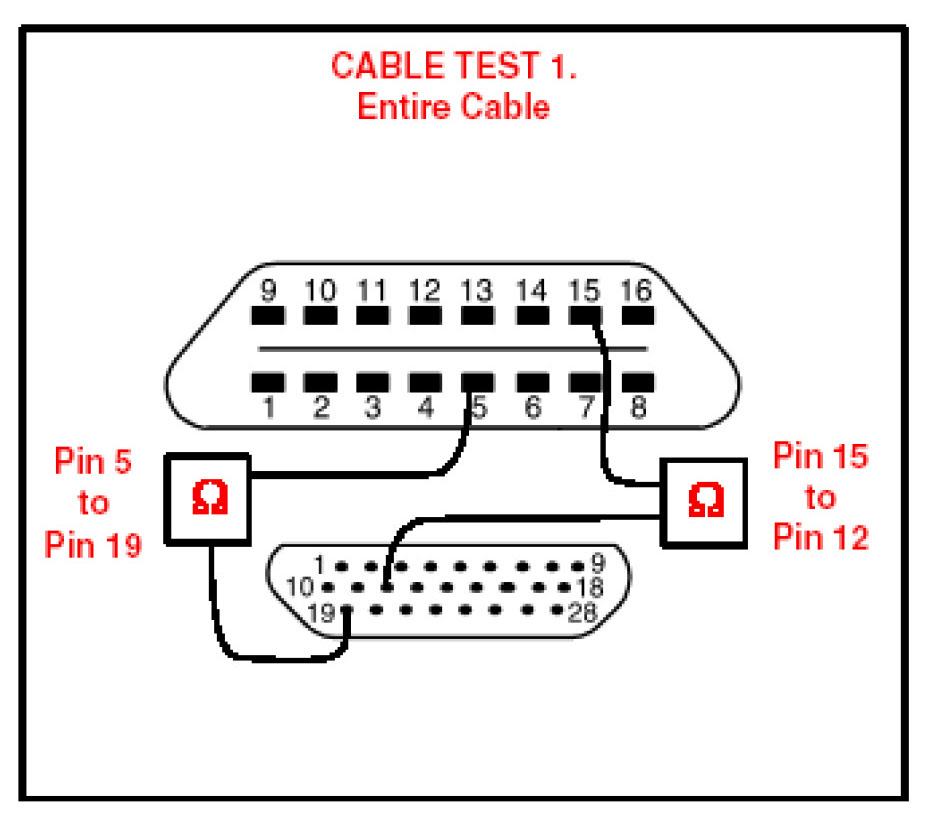 To determine if the Diagnostic Tester cable is damaged, follow the test procedures below to check the electrical integrity of the cable. Conduct all continuity tests with an Ohm meter. For all five test procedures, the resistance values must be below 6.0 ohms to pass.