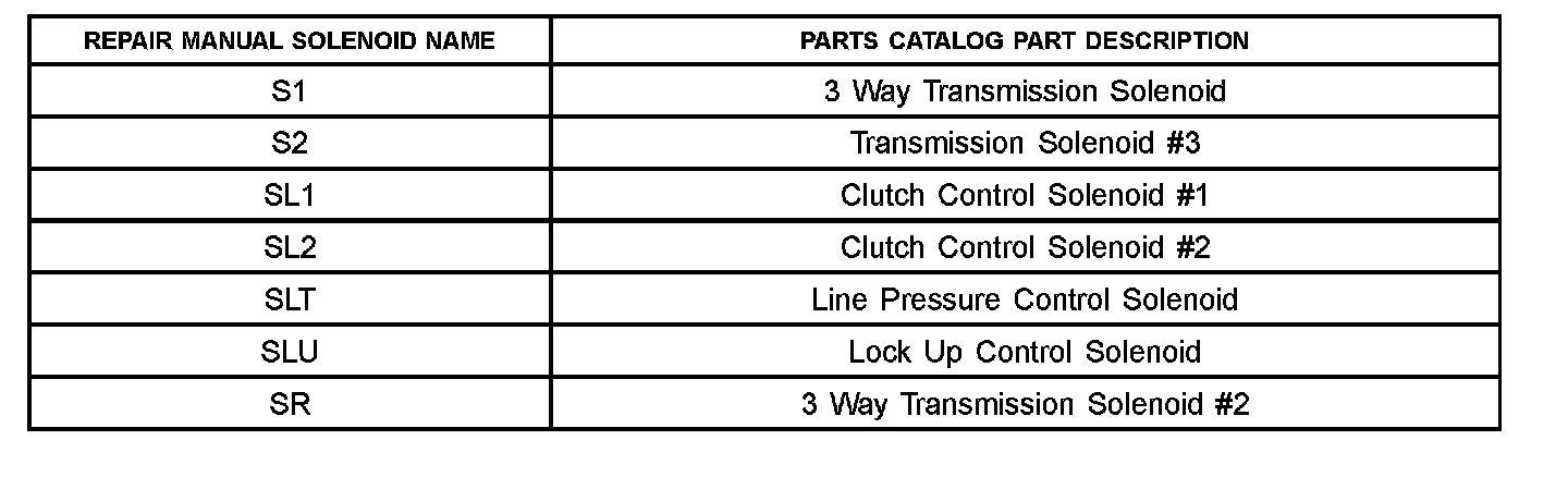 Provided is a chart listing the Repair Manual name of each solenoid used in the A750 transmission as well as the part name description provided in the electronic parts catalog.