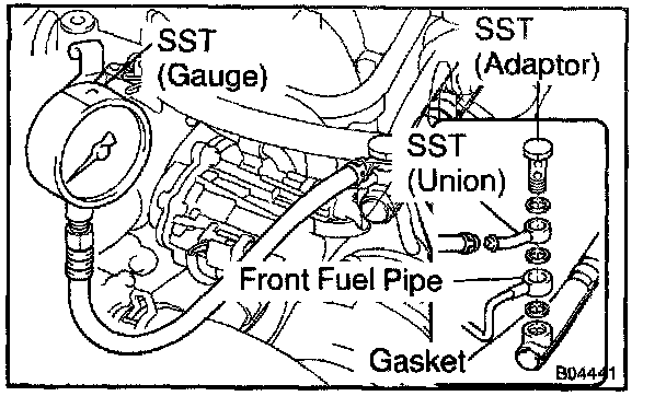 d. Install the front fuel pipe and SST (pressure gauge) to the delivery pipe with the 3 lower gaskets and SST (adaptor).