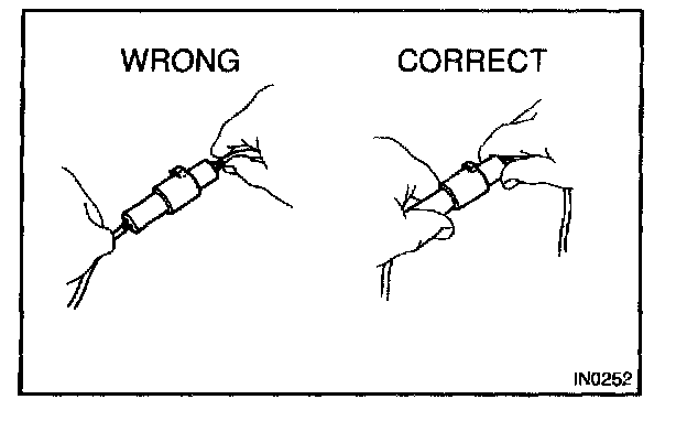 7. When checking continuity at the wire connector, insert the tester probe carefully to prevent terminals from bending.