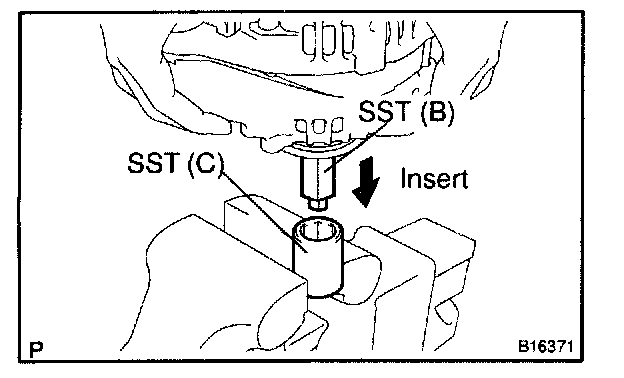 d. Insert SST (B) into SST (C), and attach the pulley nut to SST (C).