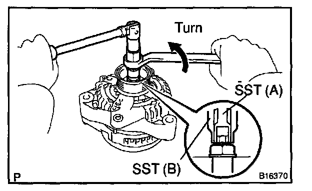 e. To loosen the pulley nut, turn SST (A) in the direction shown in the illustration.