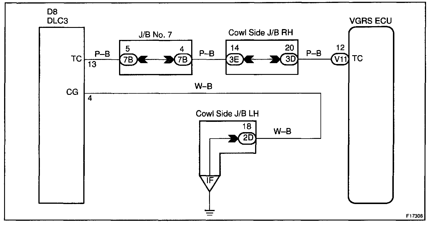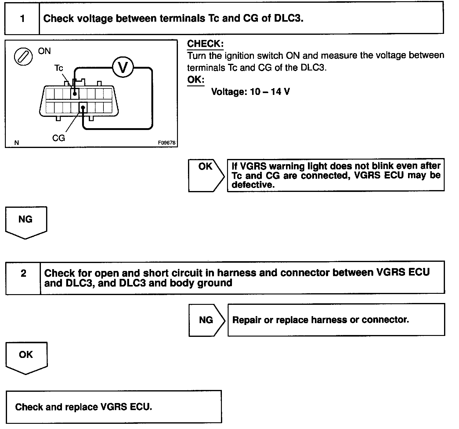 Connecting terminals Tc and CG of the DLC3 causes the VGRS ECU to display the DTC by flashing the VGRS warning light.