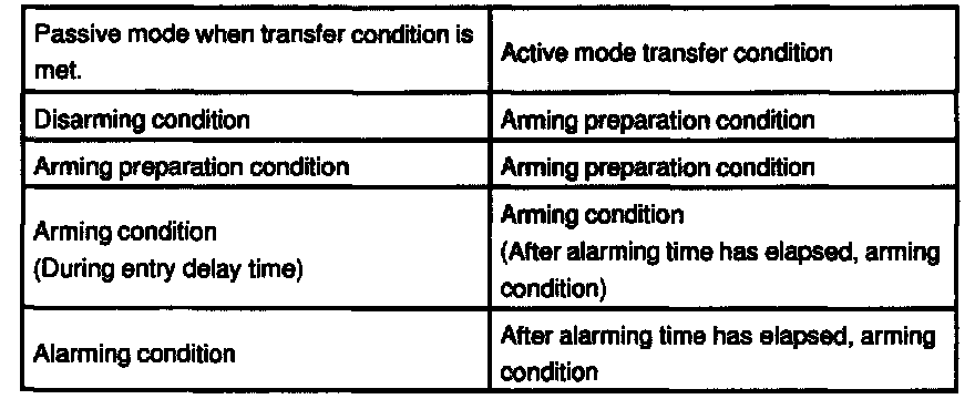 In each passive mode, when "disarming condition of active mode -> arming preparation transfer condition" is met, the active mode transfers to each condition. In this case, active mode continues till disarming condition.