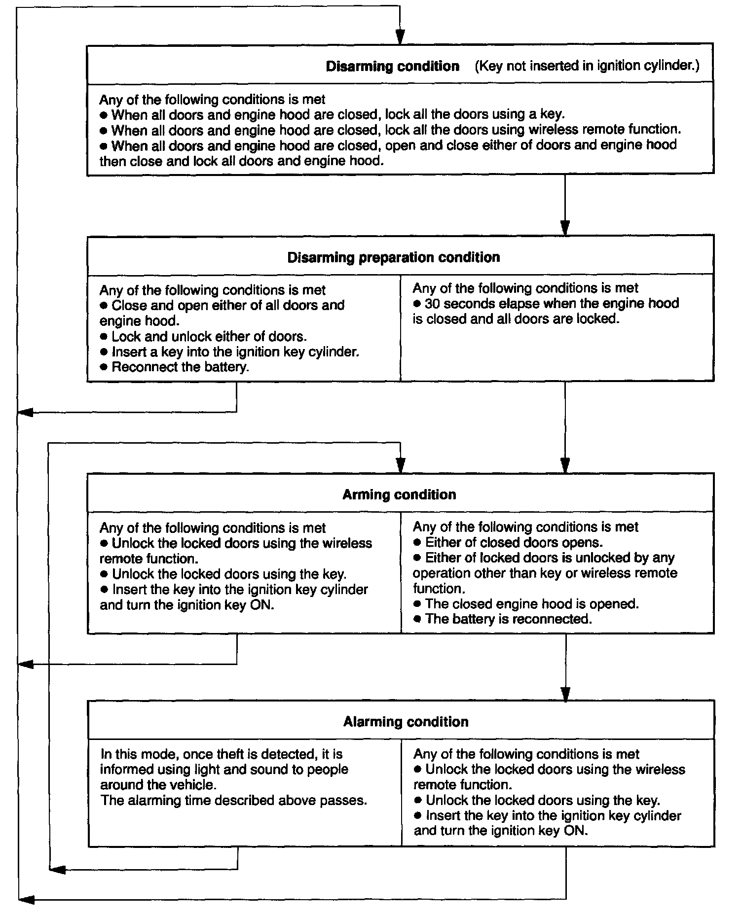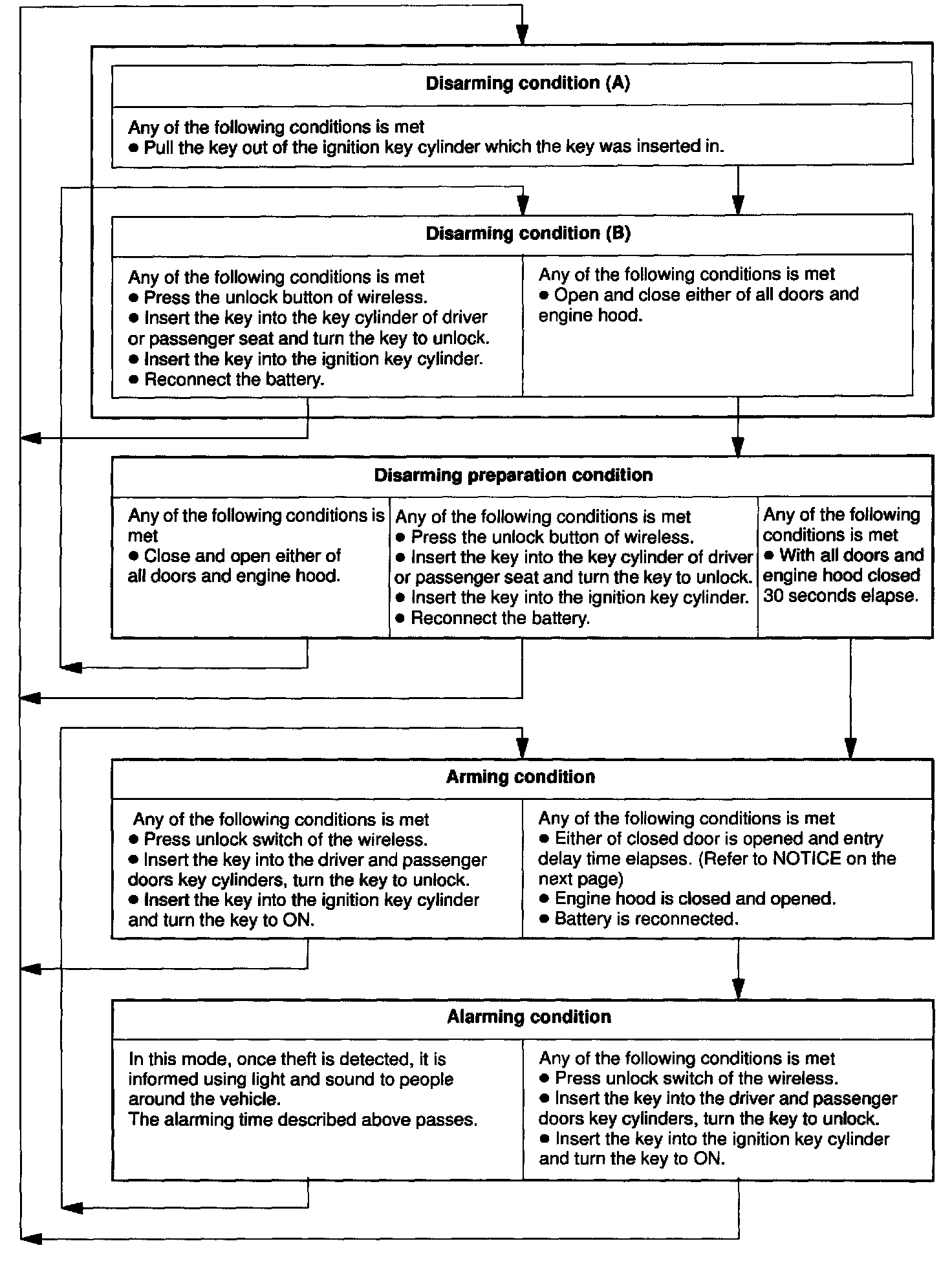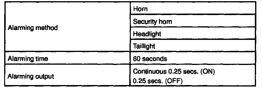Is this condition, once theft is detected, it is informed using light and sound to people around the vehicle. Refer to the table for alarming method or time.