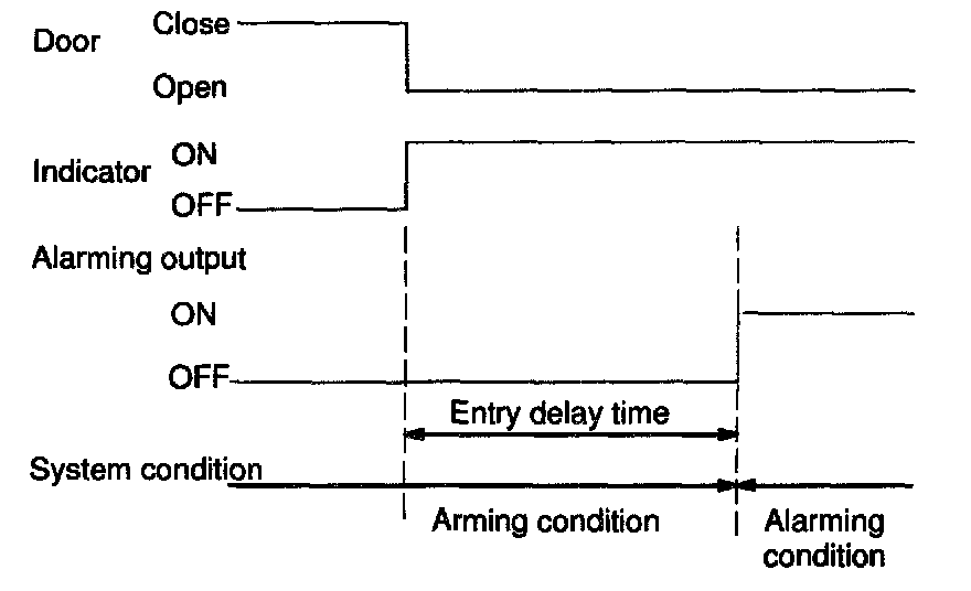 HINT: In arming condition either closed door is opened, entry delay occurs. (15 secs.)