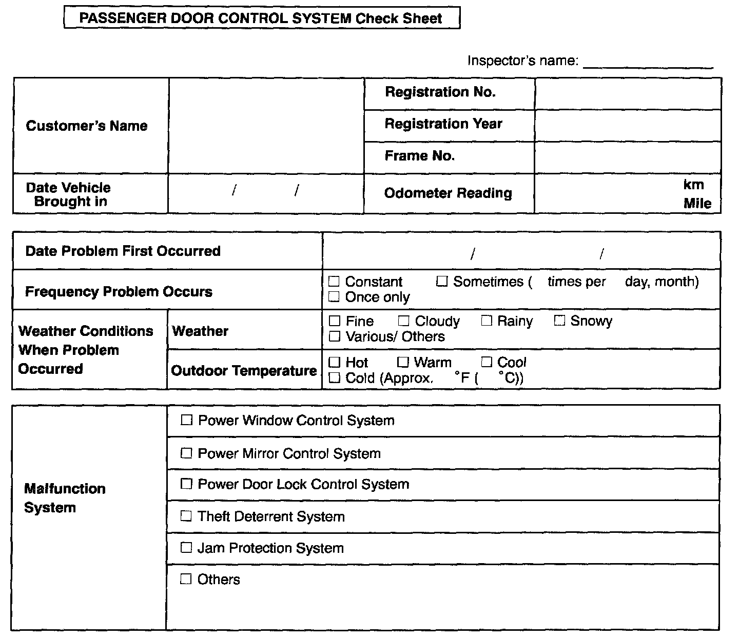 Passenger Door Control System Check Sheet: