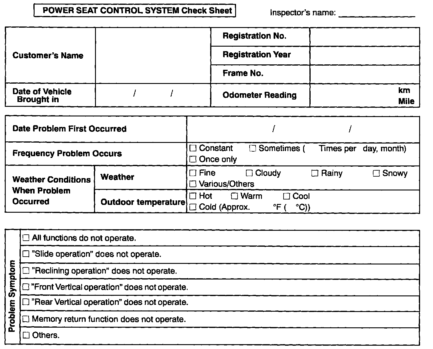 Power Seat Control System Check Sheet: