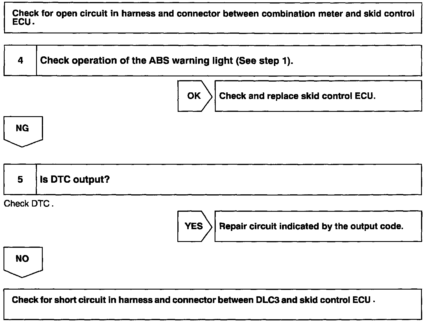 CIRCUIT DESCRIPTIONIf the ECU detects trouble, it lights the ABS warning light while at the same time prohibiting ABS control. At this time, the ECU records a DTC in memory. Connect terminals Tc and CG of the DLC3 to make the ABS warning light blink and output the DTC.