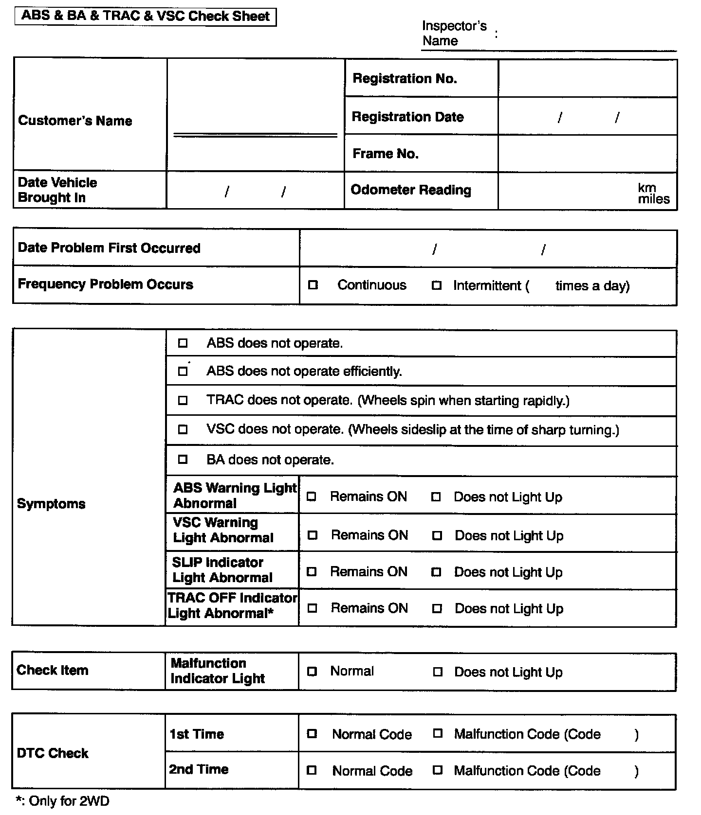 ABS & BA & TRAC & VSC Check Sheet: