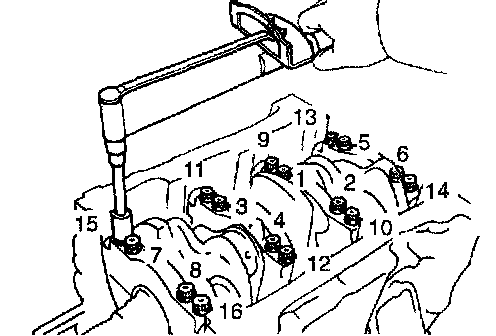 b. Install and uniformly tighten the 16 main bearing cap bolts in several passes, in the sequence shown.