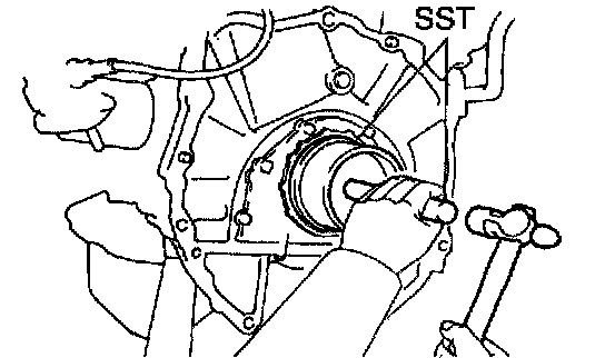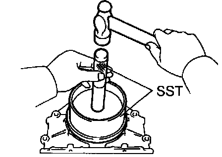 4. Using SST and a hammer, tap in the oil seal until its surface is flush with the rear oil seal retainer edge.
