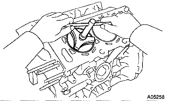 b. Using a piston, push the piston ring a little beyond the bottom of the ring travel, 105 mm (4.13 inch) from the top of the cylinder block.