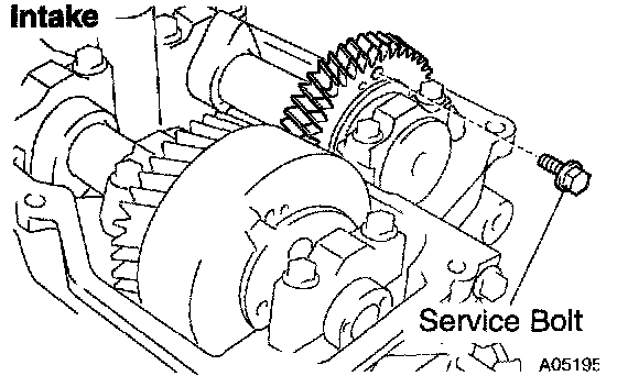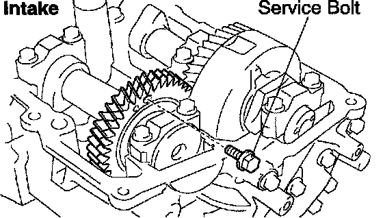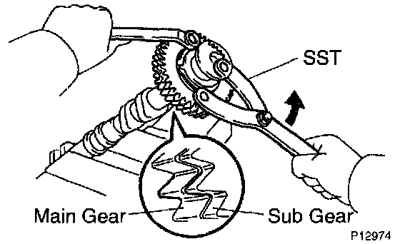 d. Using SST, align the holes of the camshaft main gear and sub-gear by turning camshaft sub-gear counterclockwise, and temporarily install a service bolt.