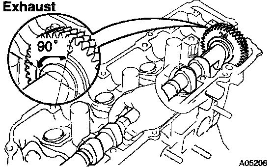 2. Place the exhaust camshaft at 90° angle of timing mark (2 dot marks) on the cylinder head.