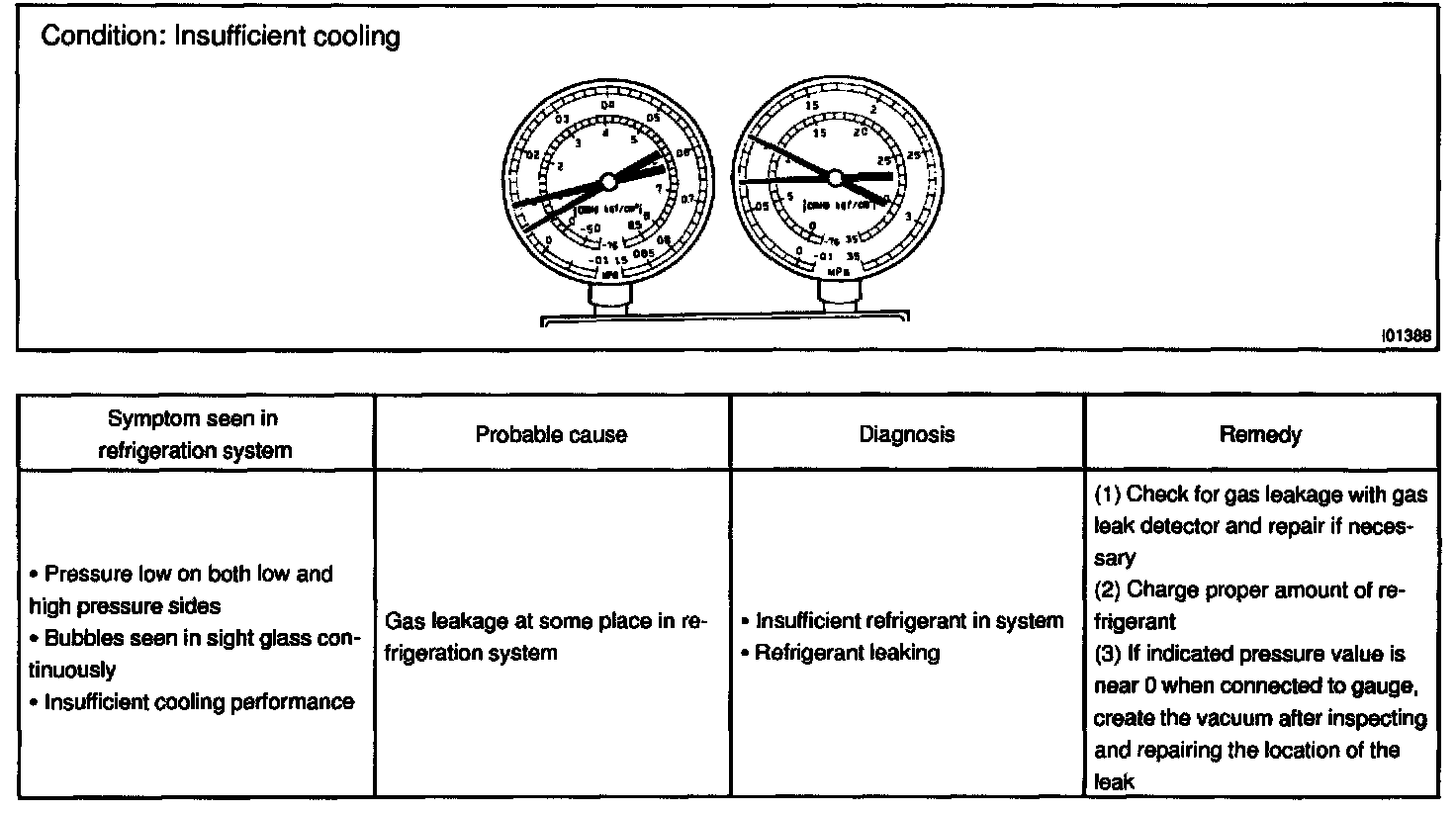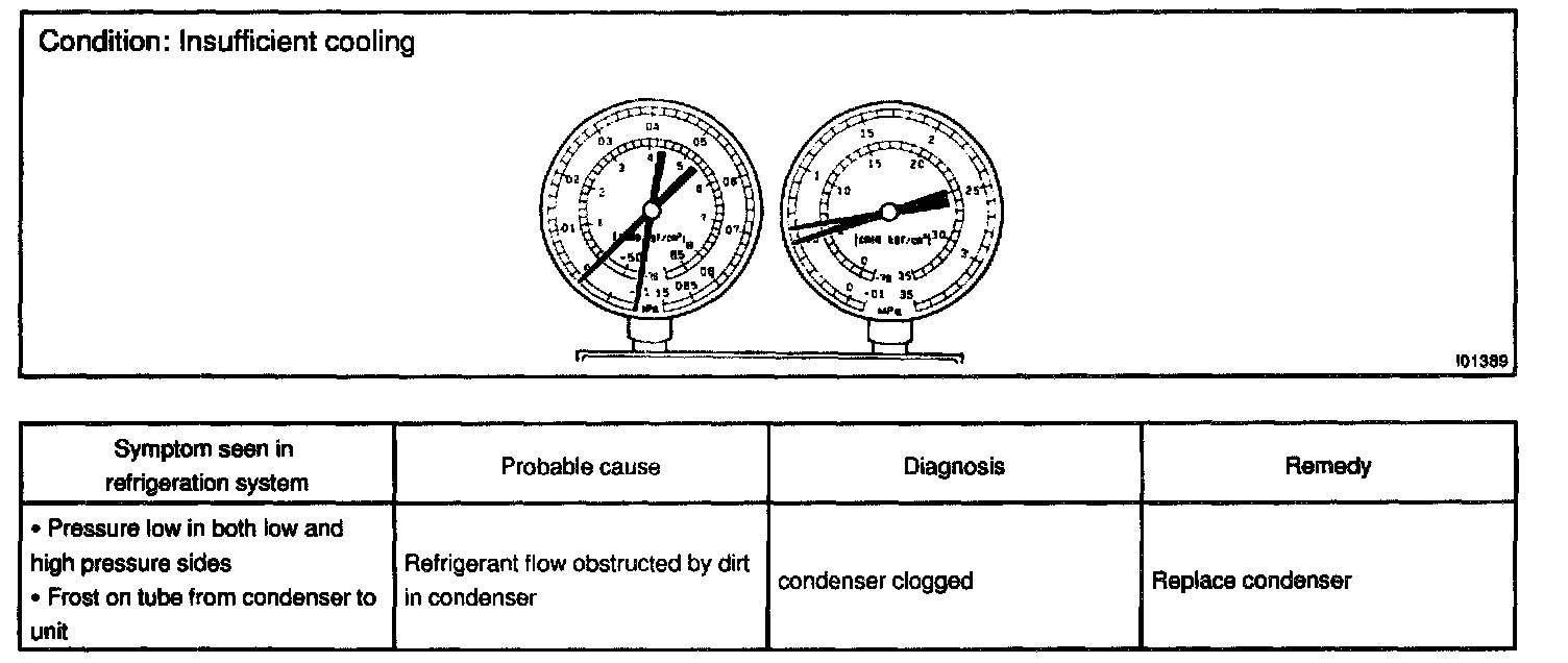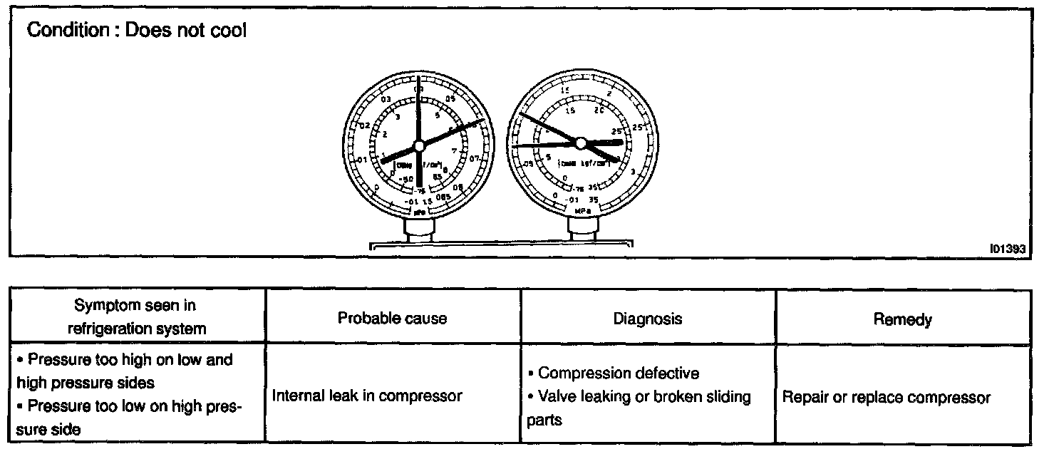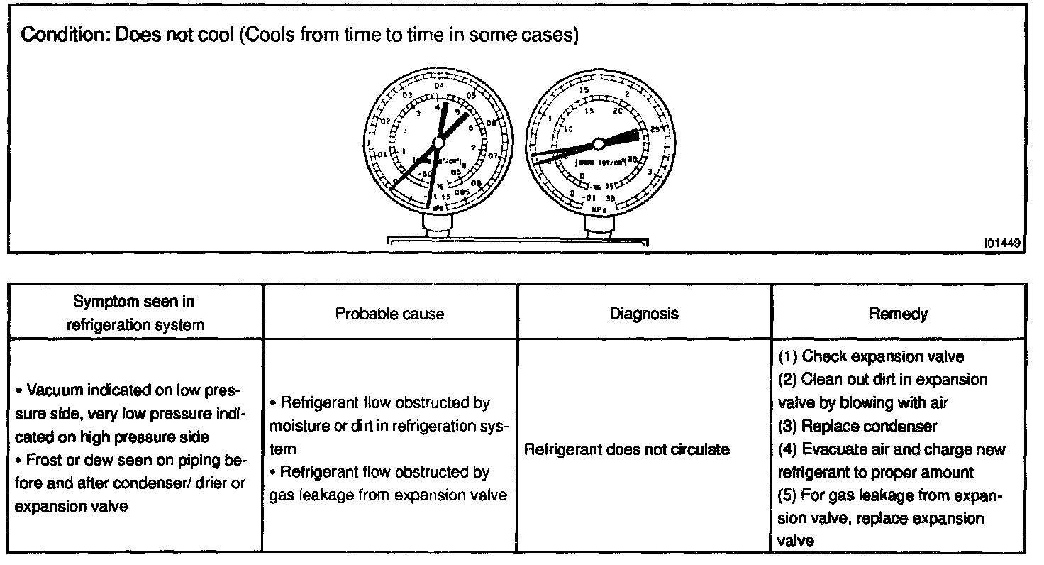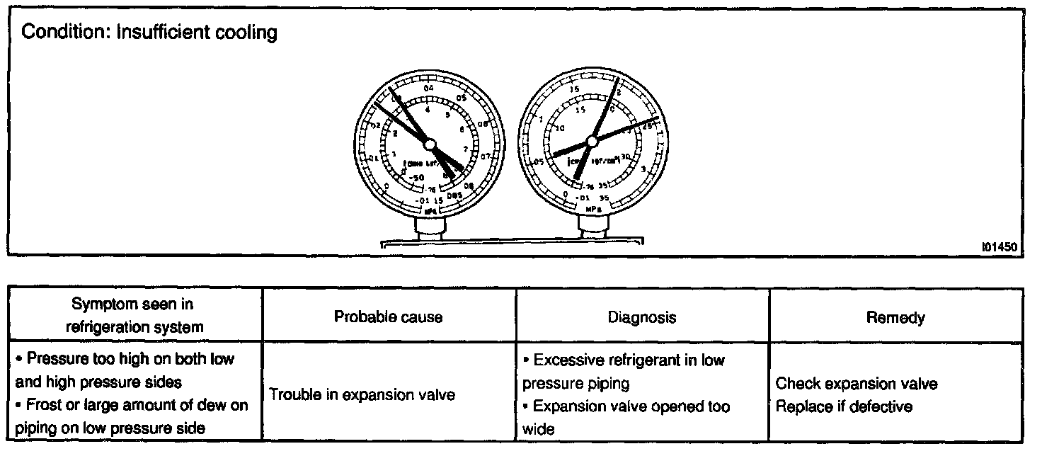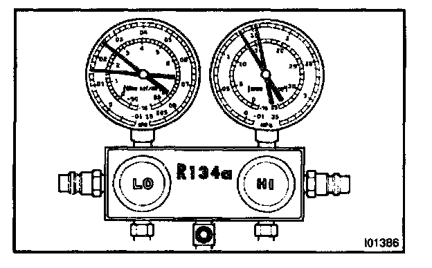 This is a method in which the trouble is located by using a manifold gauge set. Read the manifold gauge pressure when these conditions are established.