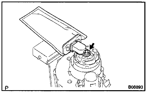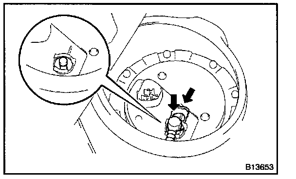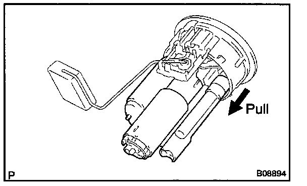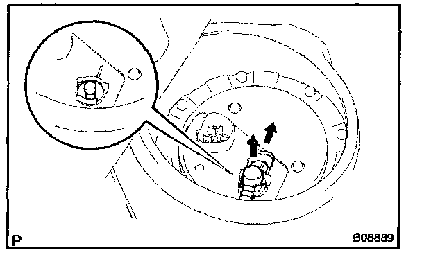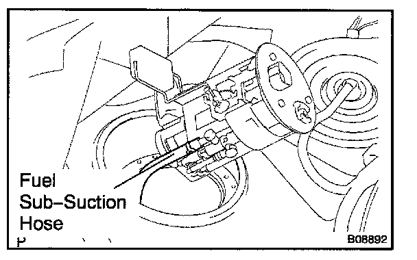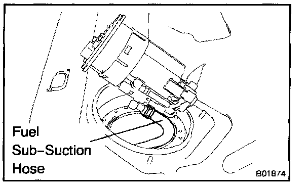 b. Lift up the fuel pump and sender gauge assembly, and disconnect the fuel sub-suction hose from the fuel return jet tube and remove the fuel pump, sender gauge assembly and gasket.