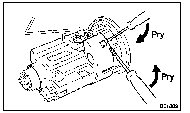 a. Using 2 screwdrivers, disconnect the 4 snap claws from the claw holes and remove the fuel suction support.